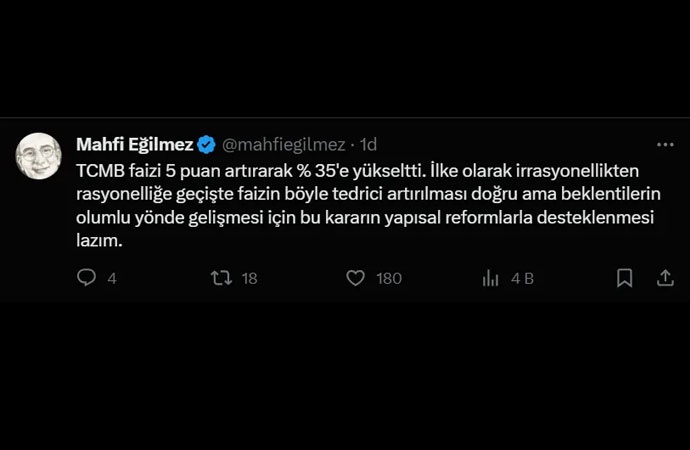 Mahfi Eğilmez: TCMB faizi 5 puan artırarak yüzde 35'e yükseltti. İlke olarak irrasyonellikten rasyonelliğe geçişte faizin böyle tedrici artırılması doğru ama beklentilerin olumlu yönde gelişmesi için bu kararın yapısal reformlarla desteklenmesi lazım.