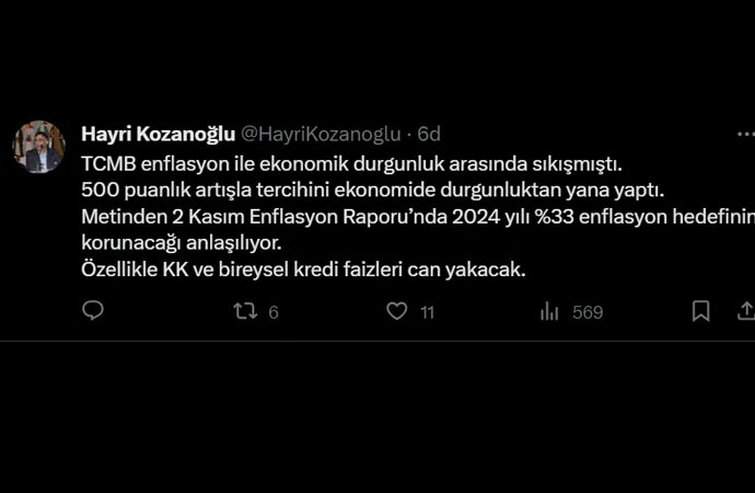 Hayri Kozanoğlu: TCMB enflasyon ile ekonomik durgunluk arasında sıkışmıştı. 500 puanlık artışla tercihini ekonomide durgunluktan yana yaptı. Metinden 2 Kasım Enflasyon Raporu’nda 2024 yılı %33 enflasyon hedefinin korunacağı anlaşılıyor. Özellikle KK ve bireysel kredi faizleri can yakacak.
