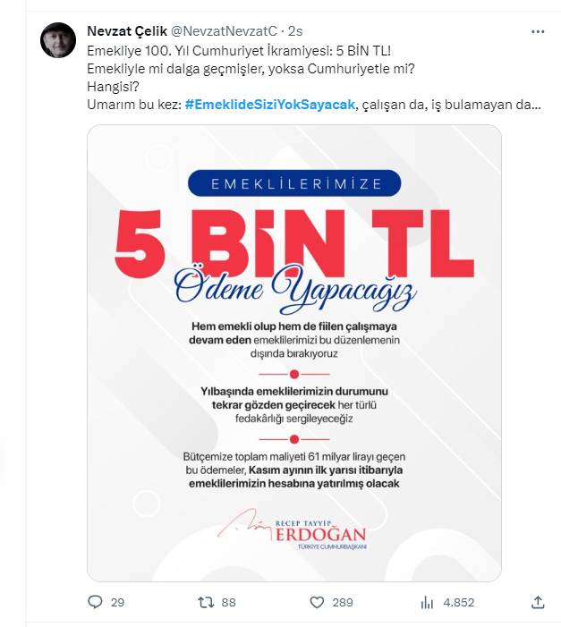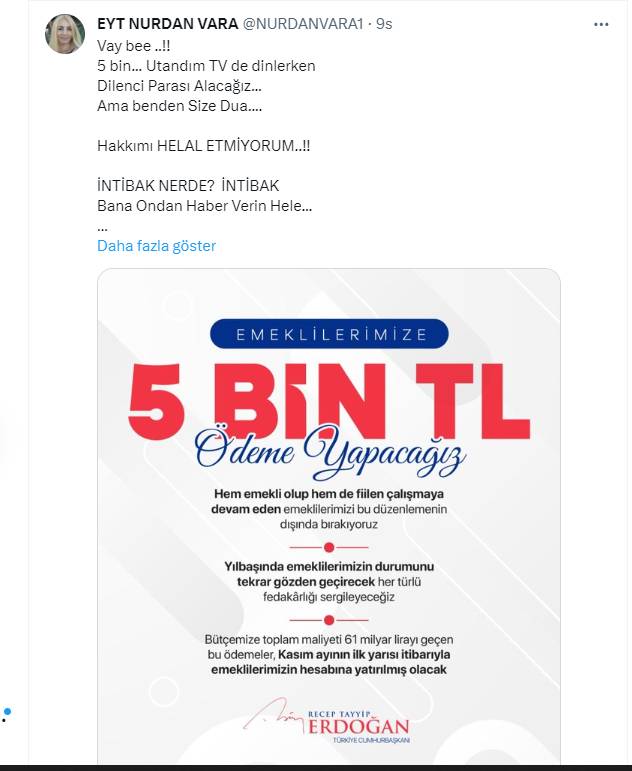 AKP'li Cumhurbaşkanı Recep Tayyip Erdoğan emeklilere bir defaya mahsus olmak üzere 5 bin lira ödeme yapılacağını duyurdu. Erdoğan detayları "Yaptığımız kapsamlı değerlendirmelerin ardından emeklilerimizi rahatlatacak karar aldık. Emeklilerimize bir defaya mahsus olmak üzere 5 bin Türk Lirası ödeme yapmayı kararlaştırdık. Hem emekli olup hem de fiilen çalışmaya devam eden emeklilerimizi kapsam dışı bırakıyoruz" sözleriyle açıkladı.