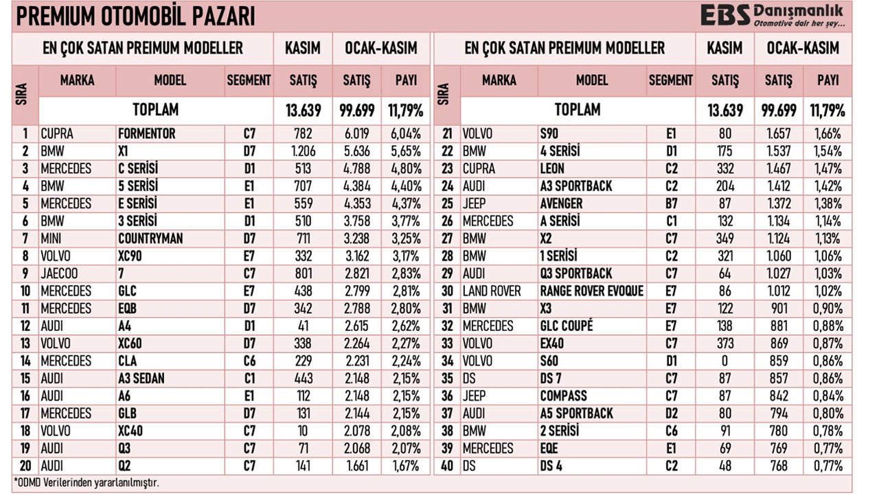 Otomotiv sektöründen gelişmeleri aktaran gazeteci Emre Özpeynirci, sosyal medya hesabından yaptığı paylaşımda, 11 ayda en çok satılan premium modelleri açıkladı. Peki, listenin zirvesinde hangi otomobil markası yer aldı? İşte, en çok satılan premium modeller...