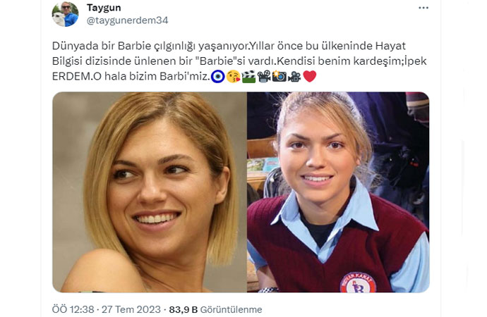 Taygun Erdem paylaşımında, “Dünyada bir Barbie çılgınlığı yaşanıyor.Yıllar önce bu ülkeninde Hayat Bilgisi dizisinde ünlenen bir "Barbie"si vardı.Kendisi benim kardeşim;İpek ERDEM.O hala bizim Barbi'miz” ifadelerini kullandı.
