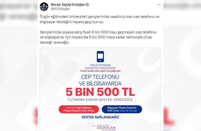 Erdoğan örgün eğitimdeki üniversite öğrencilerini kapsayan seçim vaadiyle ilgili, "Gençlerimize piyasa satış fiyatı 9 bin 500 lirayı geçmeyen cep telefonu ve bilgisayarlar için toplamda 5 bin 500 liraya kadar teknolojik cihaz desteği vereceğiz" dedi.