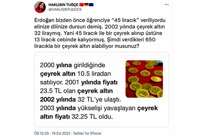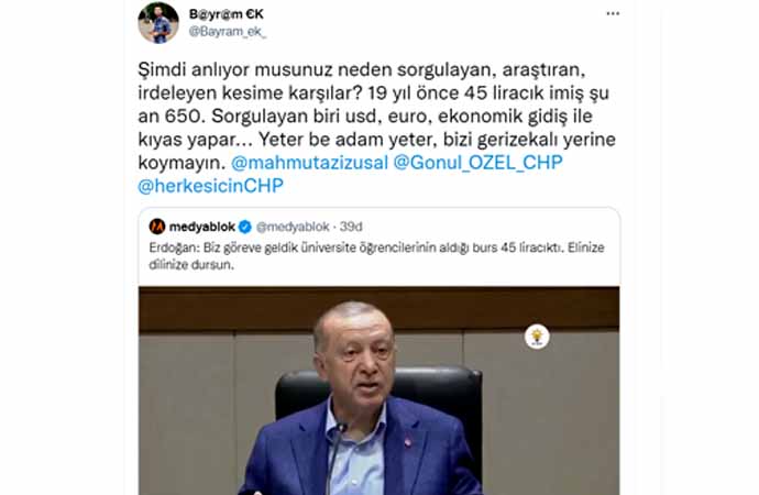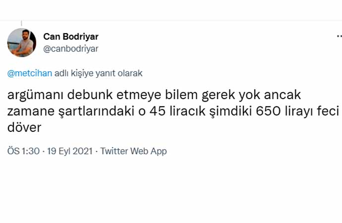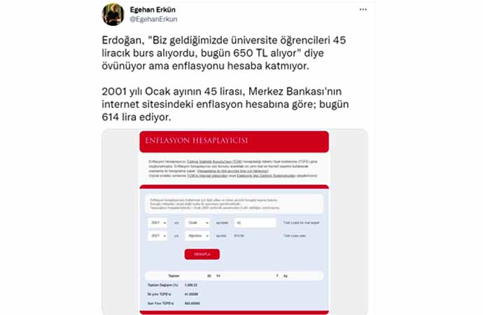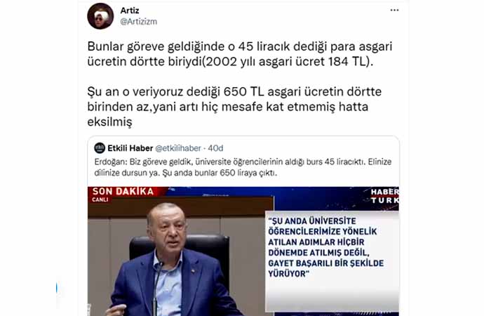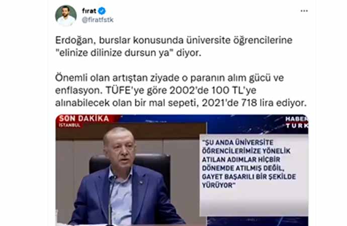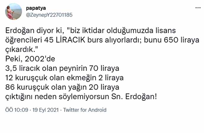 Erdoğan'ın sözlerine tepki gösteren sosyal medya kullanıcıları, TL'nin dolar karşısındaki eriyişine dikkat çekerek, "Bu algı çalışması yöntemi artık işlemiyor be reis, en gerizekalı bile 45 liracık olan dönemdeki satın alma gücüyle 600 liracık olan dönemdeki satın alma gücünü karşılaştırabiliyor" dedi.