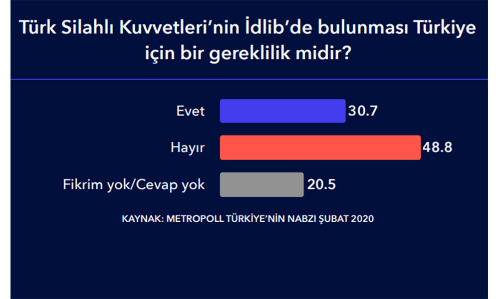 Türkiye toplumu şimdiye değin Suriye’ye gerçekleştirilen tüm askerî harekâtların arkasında durdu. Buna karşın, ilk kez İdlib’e yönelik askeri harekat konusuna sıcak yaklaşılmıyor. Şubat ayı araştırmamıza göre, %48,8’lik bir kesim Türk Silahlı Kuvvetleri’nin İdlib’de bulunmasının bir gereklilik olduğunu düşünmüyor. Askeri olarak İdlib’de bulunulması gerektiğini düşünenler ise toplam seçmenin %31’ini teşkil ediyor.