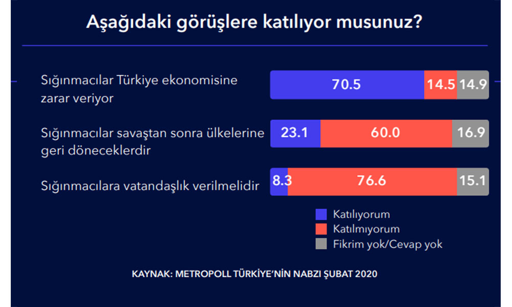 İdlib krizinin de bir sonucu olarak ülkemizde yaşayan sığınmacıların sayısı günden güne arttıkça halkın Suriyeli sığınmacılara bakışı olumsuz bir hâl almaya başladı. Bulgularımıza göre seçmenin %70,5’i sığınmacıların ekonomiye zarar verdiğini; %60’ı sığınmacıların savaştan sonra evlerine dönmeyeceklerini ve %76,6’sı da sığınmacılara vatandaşlık verilmemesi gerektiğini düşünüyor.