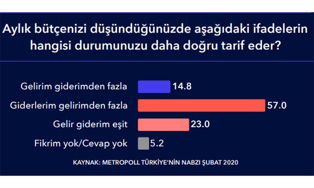 Gelir-gider dengesindeki dengesizlik, toplumun büyük kesimini etkileyen sarsıcı bir gerçeklik olarak karşımıza çıkıyor. Toplumun %57’si, “ekside yaşıyor”: diğer bir deyişle, Türkiye’nin büyük çoğunluğunun giderleri, gelirlerinden fazla. Bu da borçlanarak yaşadığımız anlamına geliyor. “Gelirim, giderimden fazla” diyebilenlerse yaklaşık %15’lik bir “azınlık”.