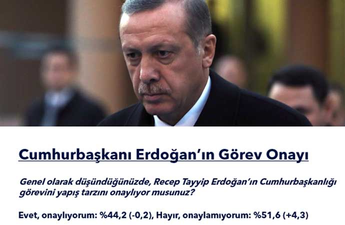 Ankete göre, "Seçim olsa hangi partiye oy verirsiniz?" sorusuna AKP cevabını verenlerin yüzde 7,8'inin Erdoğan'ın görevini yapış tarzını onaylamadığı ortaya çıktı. Yüzde 89,2'si Erdoğan'ın görevini onaylardığını söyledi. MHP yanıtı verenlerin yüzde 31,1'inin 'Erdoğan'ın görev yapış tarzını onaylamıyorum' yanıtını vermesi de dikkat çekti. yüzde 66'lık kesim ise 'onaylıyorum' dedi. CHP'ye oy vereceğini söyleyenlerin ise yüzde 83,1'i Erdoğan'ın görev yapış tarzını onaylamadığını söylerken yüzde 13'lük kesim 'onaylıyorum' yanıtını verdi.