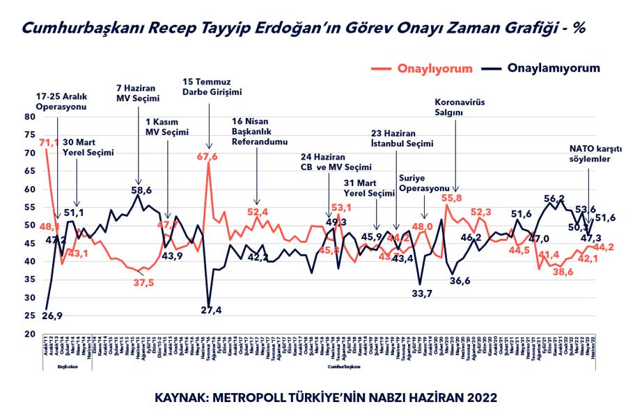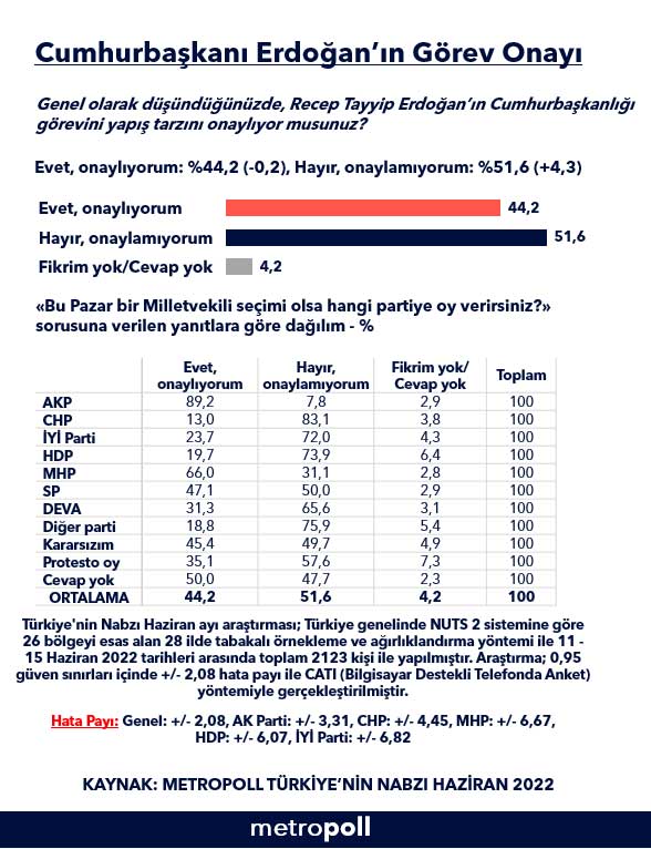 Araştırma şirketi "Türkiye'nin Nabzı Haziran 2022: Cumhurbaşkanı Recep Tayyip Erdoğan'ın Görev Onayı" araştırmasını yayınladı. Araştırmada Erdoğan'ın görev onayındaki düşüş dikkat çekti. "Recep Tayyip Erdoğan'ın Cumhurbaşkanlığı görevini yapış tarzını onaylıyor musunuz?" sorusunun sorulduğu seçmenin yüzde 51,6'sı 'hayır, onaylamıyorum' yanıtını verirken, yüzde 44,2'si 'evet, onaylıyorum', yüzde 4,2'si ise 'fikrim yok' dedi.