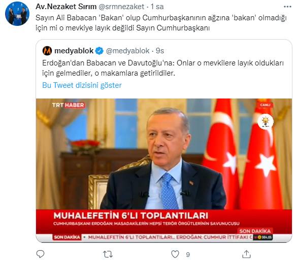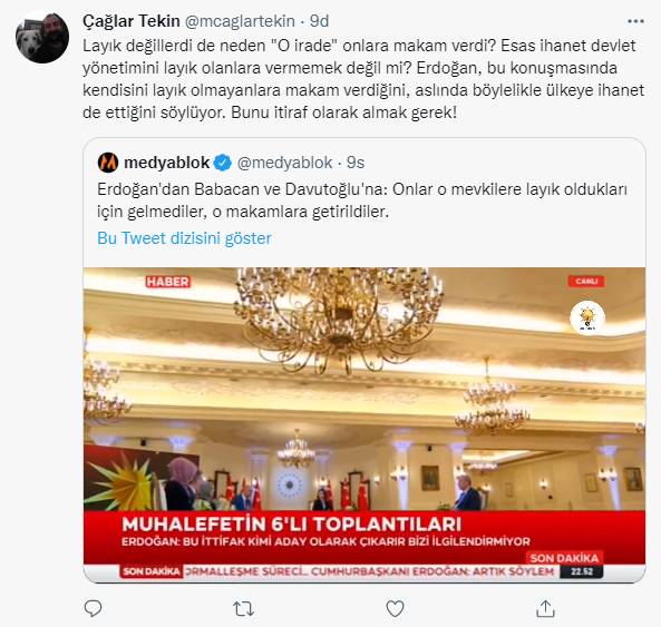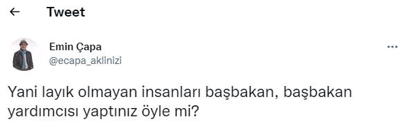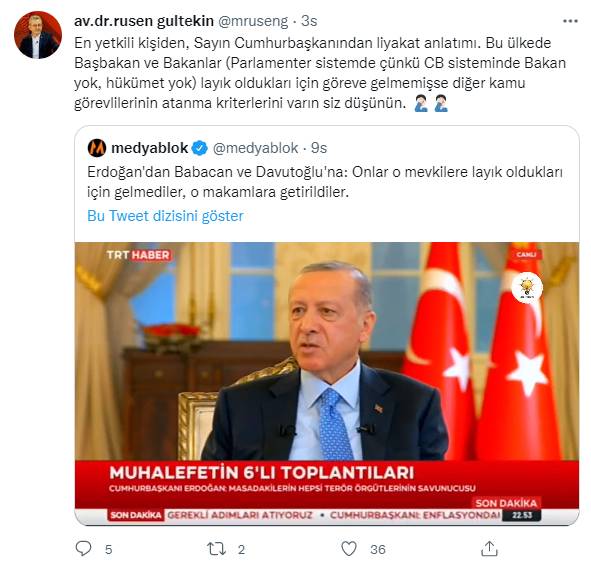 AKP'li Cumhurbaşkanı Recep Tayyip Erdoğan, partisinin iktidarında uzun yıllar bakanlık koltuğunda oturan Ali Babacan ve hem bakanlık hem de başbakanlık koltuğunda oturan Ahmet Davutoğlu için "Onlar o makamlara kendileri layık oldukları için gelmediler" açıklaması yaptı.