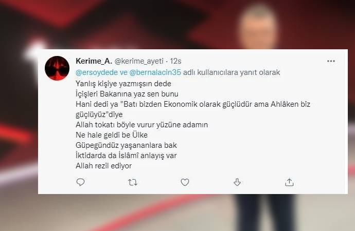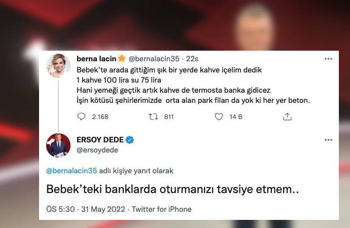 Berna Laçin, ekonomik krize tepki gösteren bir paylaşım yaptı. Bebek'teki fiyatlara tepki gösteren Laçin'e, TRT spikeri yandaş Ersoy Dede'den cinsiyetçi yanıt geldi. Ersoy, önceki gün Bebek'te kaydedilen cinsel ilişki görüntüleri üzerinden gönderme yaptı.