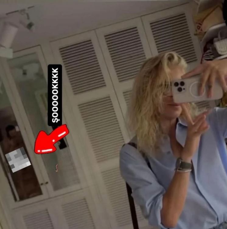 Kısa sürede dikkat çeken paylaşımda, Esmersoy’un arkasındaki aynada çırılçıplak görünen eşi Nazım Akmandil yer alıyordu.