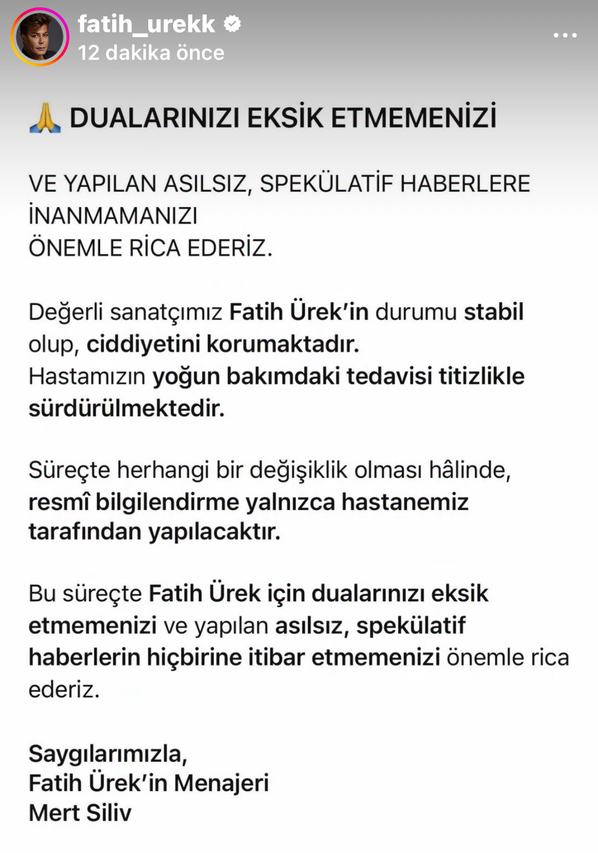 Öte yandan Fatih Ürek'in menajeri Mert Siliv yaptığı açıklamada "“Durumu stabil olup, ciddiyetini korumaktadır. Dualarınızı eksik etmeyiniz” dedi.