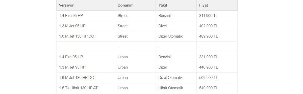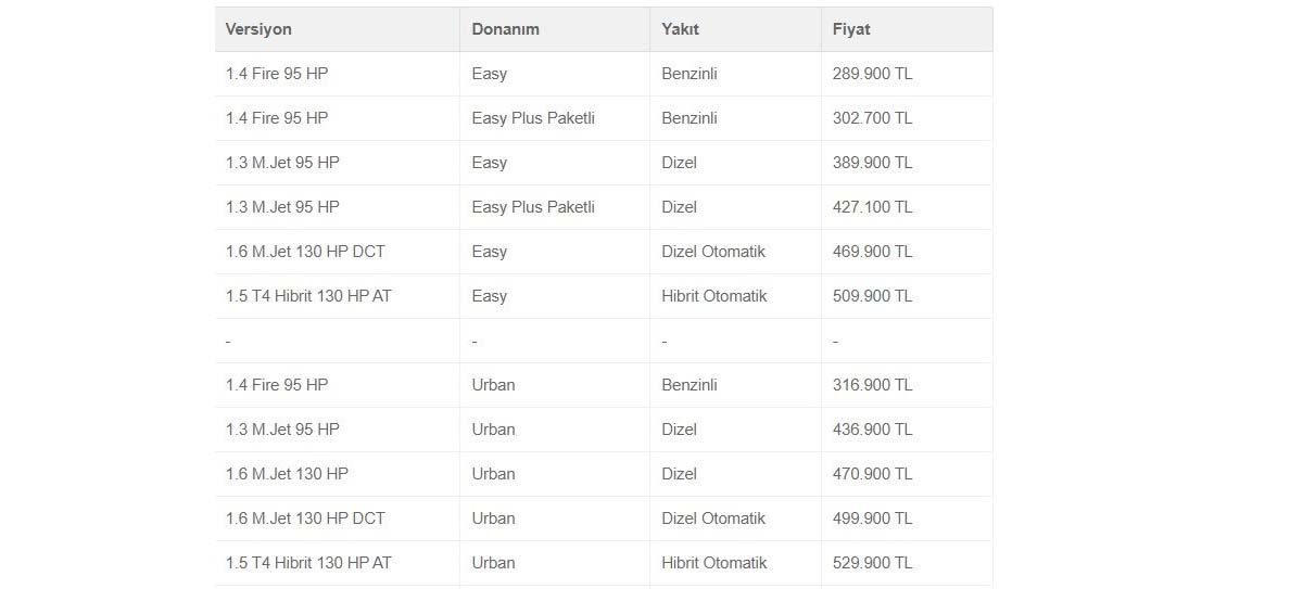 Dizel otomatik ve hibrit versiyonları satışa çıkan Fiat Egea'nın başlangıç fiyatı 300 bin TL'den başlıyor. Fiat ailesine yeni katılan Nisan ayı 2022 Egea yeni tasarımı ve özellikleriyle kendinden söz ettireceğe benziyor. Mart ayında giriş seviyesindeki Fiat Egea Sedan'ın i 1.4 Fire 95 HP Easy versiyonu için 265.900 TL'yi görmüştü. Fiat'ın Nisan ayına aynı modeli ise 289 TL'den araç severlerin karşısına çıktı. Aynı özelliklere sahip olan 1.3 M.Jet 95 HP motorlu Egea Sedan'ın fiyatı 381.900 TL ile 389.900 TL arasında değişiyor.