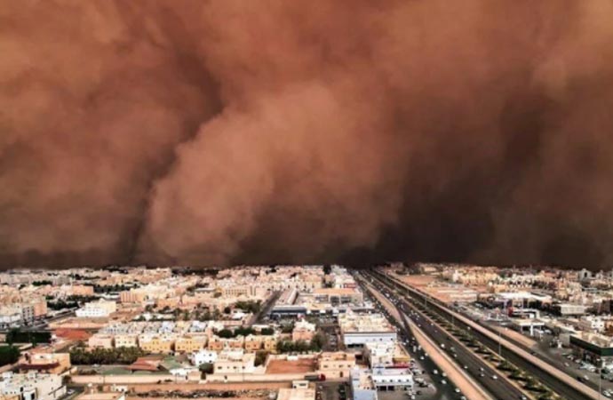 Öte yandan Ulusal Meteoroloji Enstitüsü'nün uyduları, kum fırtınasının saatte 60 kilometreye varan rüzgarlarla ilerlediğini gösterdi.