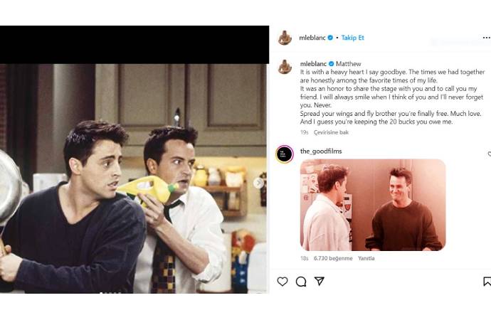 Dizide Chandler’ın en yakın arkadaşı Joey karakterine hayat veren Matt LeBlanc ise Perry ile diziden karelerini yayınladı.