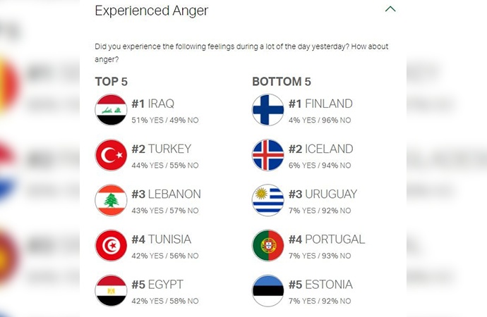 Türkiye, 'en stresli' ülkeler arasında da dördüncü sırada yer aldı. Ankette son bir günde stres duygusunun en çok hissedildiği ülkeler Peru, Lübnan, Ekvador, Türkiye ve Yunanistan olarak sıralandı. En az stresli ülkeler ise Kırgızistan, Kazakistan, Özbekistan, Mauritius ve Rusya olarak sıralandı.