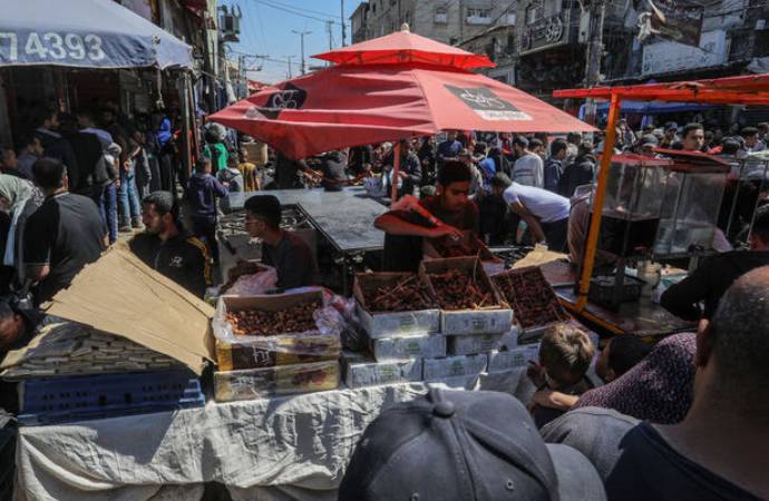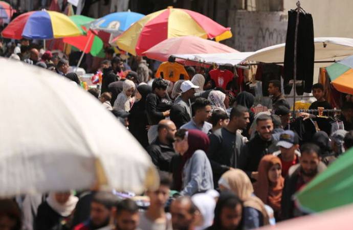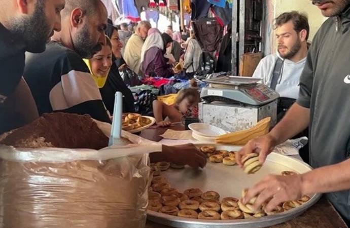Aylardır kuşatma altındaki Gazze kent merkezinde yer alan Ömer el-Muhtar Mahallesindeki Sahabe pazarına alışveriş yapmak için gelen Gazzeliler, yaşadıkları tüm acıya rağmen bayram sevincini yaşamaya çalıştı.