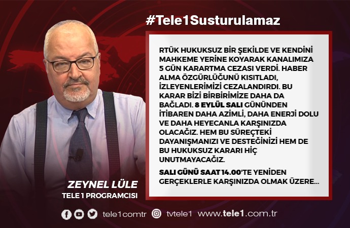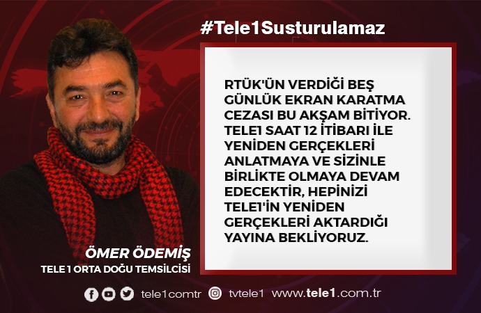 RTÜK'ün verdiği beş günlük ekran karatma cezası bu akşam bitiyor. TELE1 saat 12 itibarı ile yeniden gerçekleri anlatmaya ve sizinle birlikte olmaya devam edecektir, Hepinizi TELE1'in yeniden gerçekleri aktardığı yayına bekliyoruz