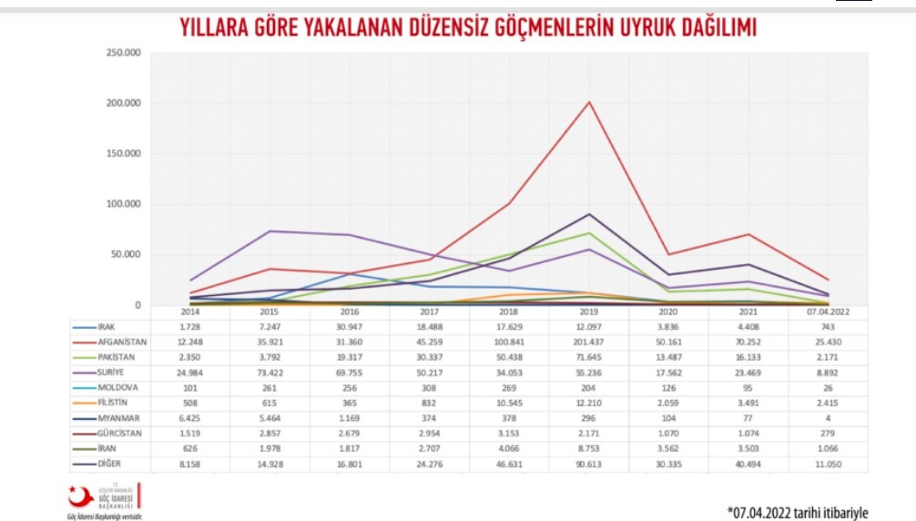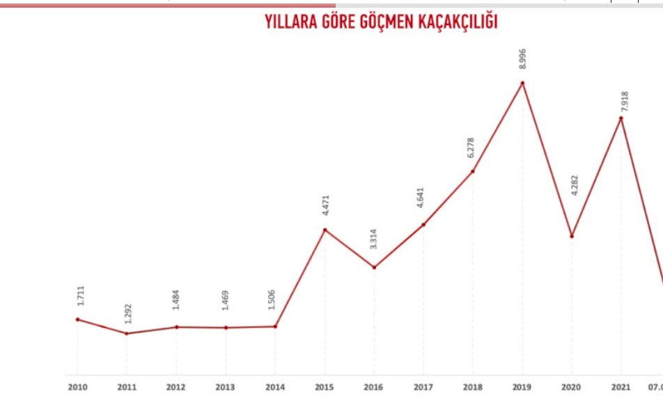 8 bin 996 mülteci kaçakçılığıyla 2019 yılın en fala kaçakçılık yapılan yıl olurken onu 7 bin 918 mülteci kaçakçılığıyla 2021 yılı takip etti.