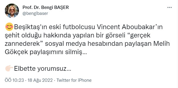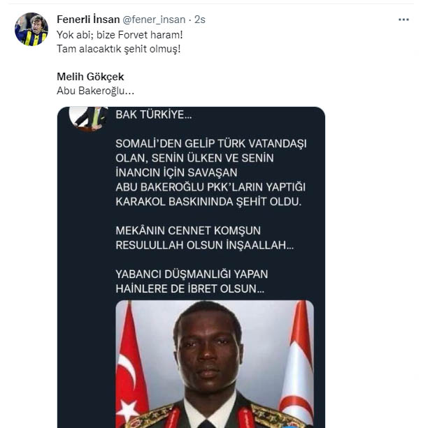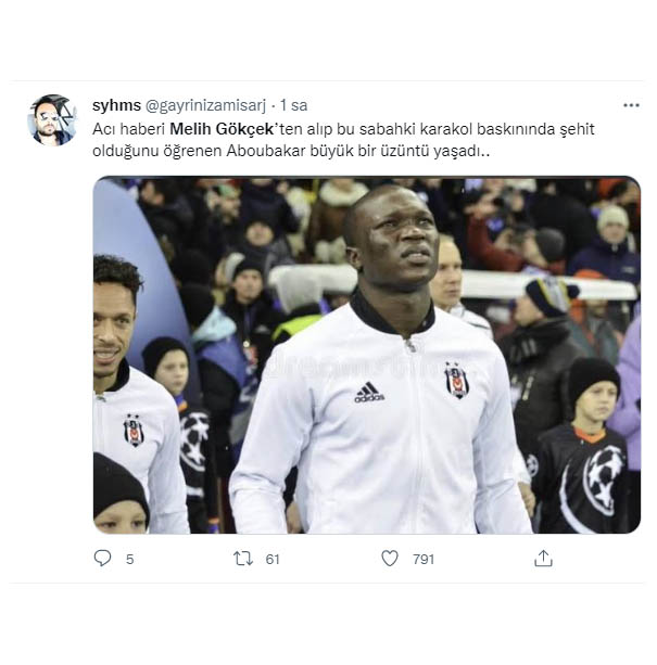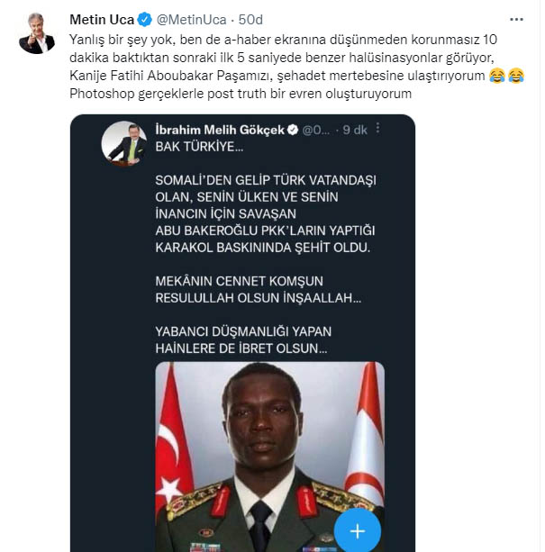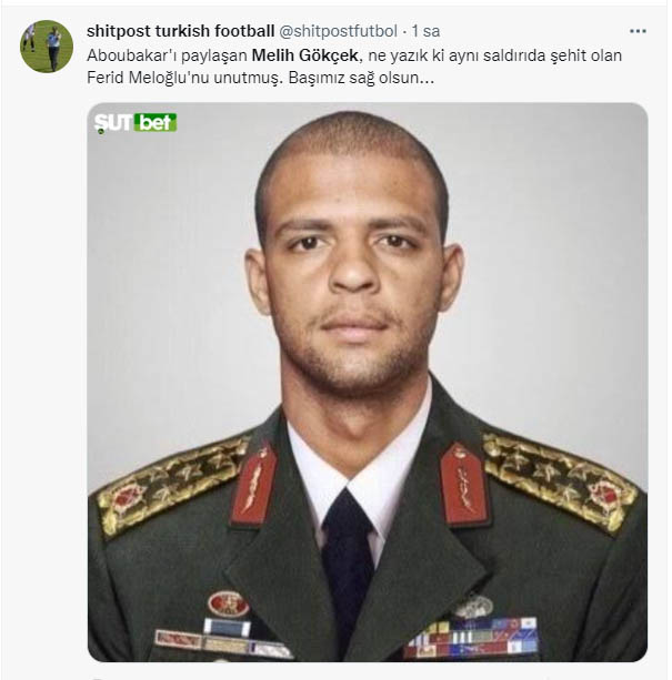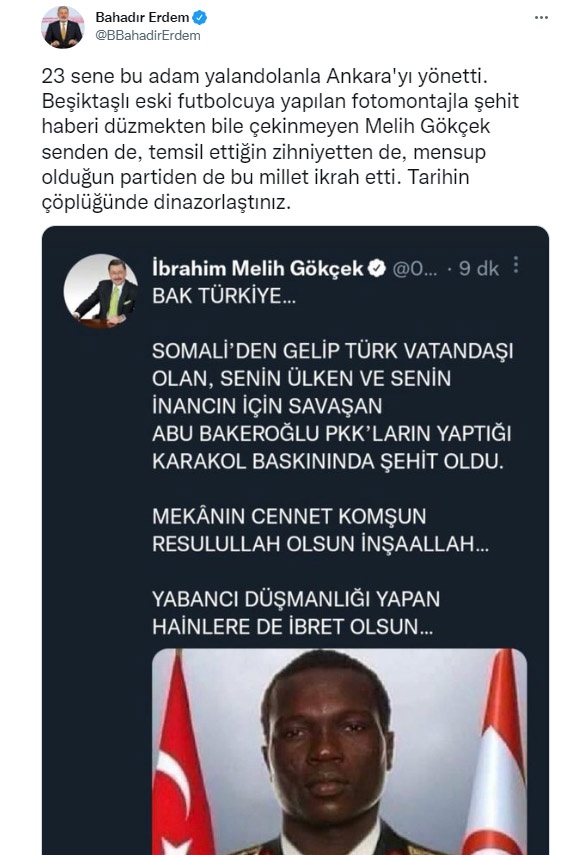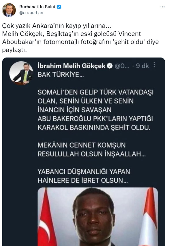 Eski Ankara Büyükşehir Belediye Başkanı Melih Gökçek'in Aboubakar'ın photoshoplu fotoğrafını paylaşarak, "Abu Bakeroğlu, PKK’nın karakol saldırısında şehit düştü" ifadelerini kullandı.