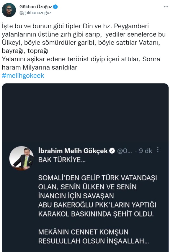 Gökhan Özoğuz, Gökçek'in paylaşımına, "İşte bu ve bunun gibi tipler Din ve hz. Peygamberi yalanlarının üstüne zırh gibi sarıp, yediler senelerce bu Ülkeyi, böyle sömürdüler garibi, böyle sattılar Vatanı, bayrağı, toprağı