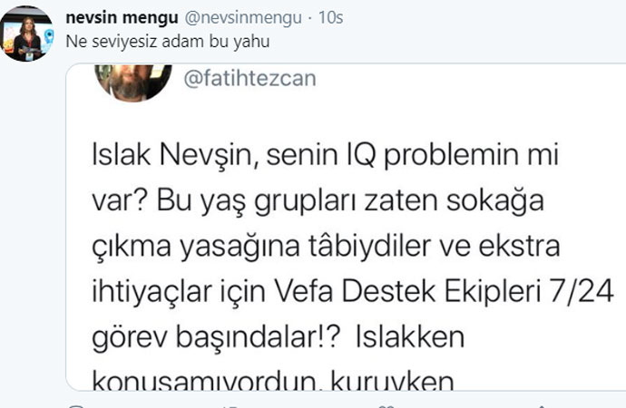 Nevşin Mengü, gerici Fatih Tezcan'ın twitini alıntılayıp, "Ne seviyesiz adam bu yahu" diye yazdı.