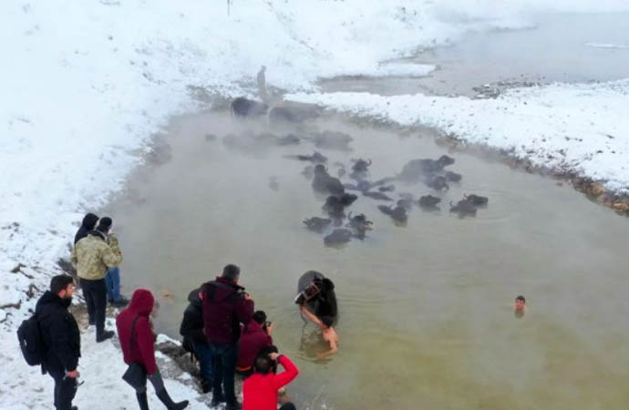 Yazın yerli ve yabancı ziyaretçileri ağırlayan Budaklı köyündeki kaplıca, kışın da sıcak suya giren manda ve atları çekmek isteyen fotoğraf tutkunlarına ev sahipliği yapıyor.
