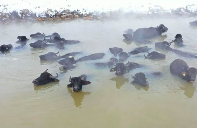 Hava sıcaklığının sıfırın altında 20 dereceye kadar düştüğü köyde, kış şartlarının ağır geçmesinden dolayı ahırlardan dışarıya çıkarılamayan manda ve atlar, sahipleri tarafından belirli aralıklarla kaplıcaya götürülerek yıkanıyor.