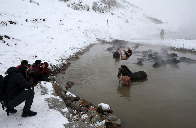 Farklı illerden kente gelen fotoğrafçılar, sıcak sudaki manda ve atların sırtından kaplıcaya dalış yapan gençleri de fotoğraf karelerine yansıtıyor.