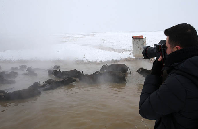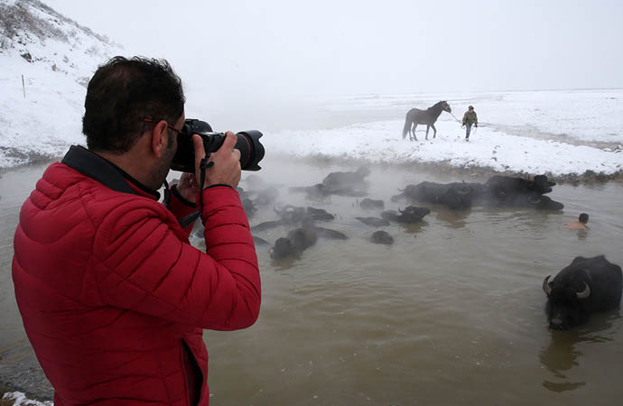 Fotoğraf tutkunları da bölgede etkisini sürdüren soğuk hava nedeniyle buharlaşmanın yoğun yaşandığı 40 derece sıcaklıktaki kaplıcada yıkanan manda ve atları görüntülemeye çalışıyor.