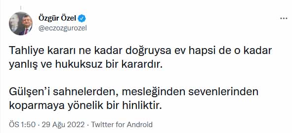 Gülşen'in tahliyesinin ardından ev hapsi kararına siyasetçi ve sanatçılardan tepki yağdı.