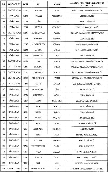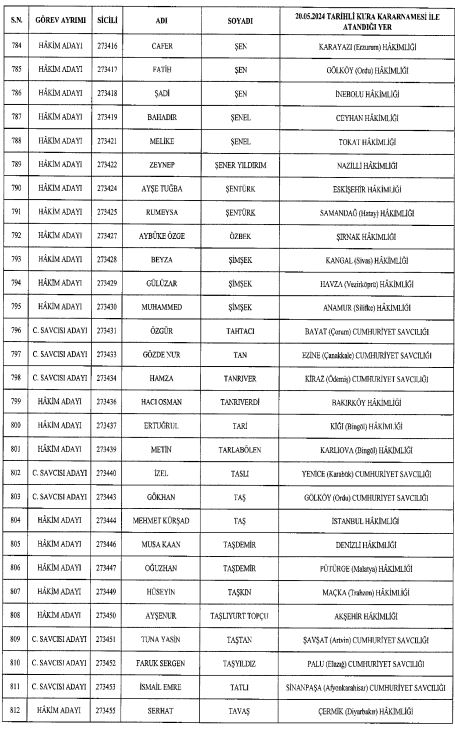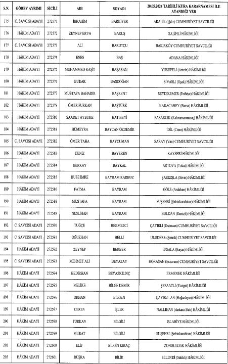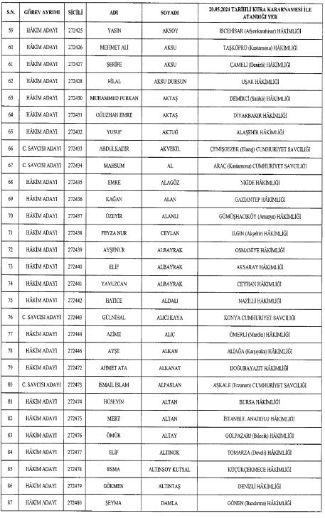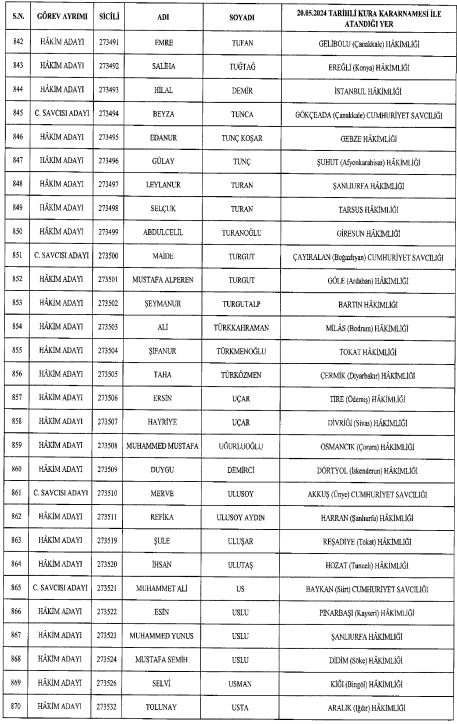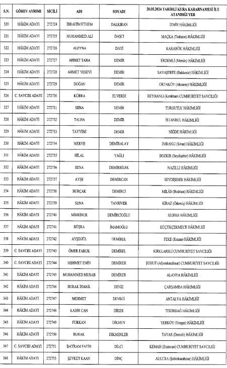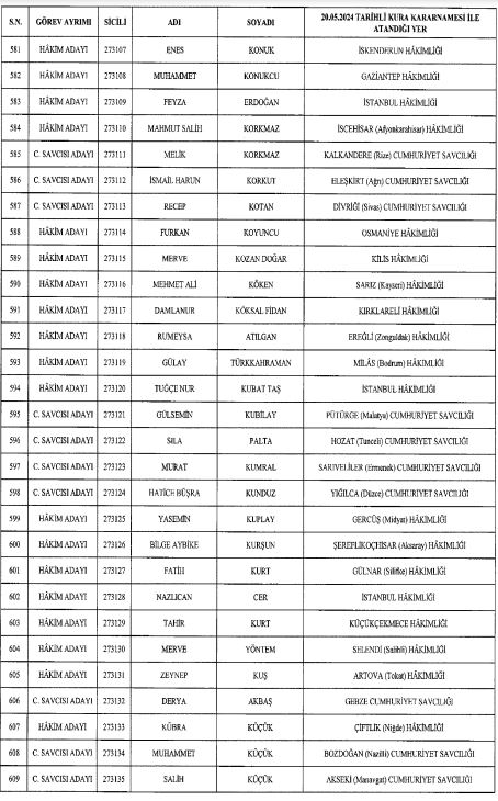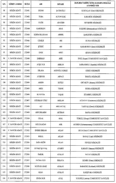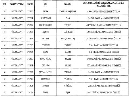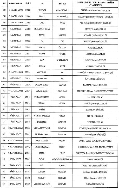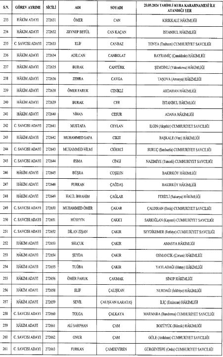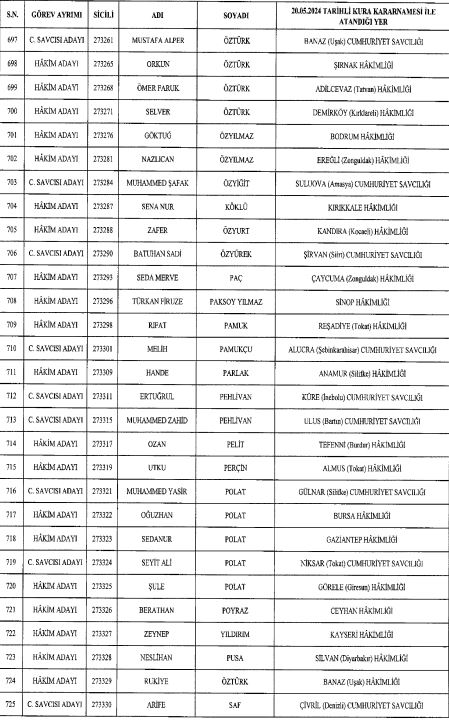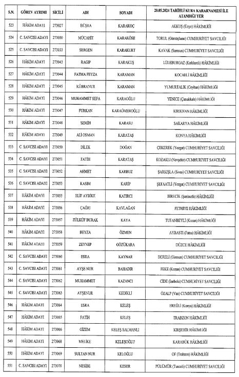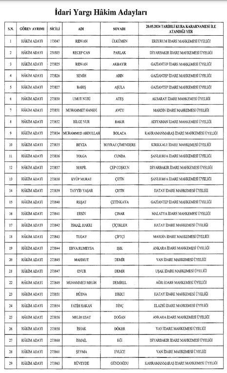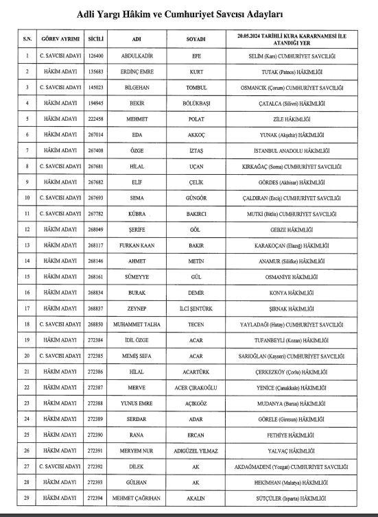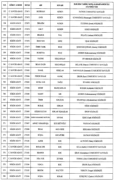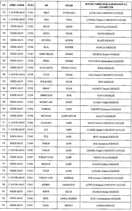Kararda, “Adli yargı hâkim ve Cumhuriyet savcısı adayları ile idari yargı hâkim adaylarının, Hâkimler ve Savcılar Kurulunca 20.05.2024 tarihinde yapılan ad çekme sonucuna göre, 2802 sayılı Hâkimler ve Savcılar Kanunun 13. maddesi gereğince atanmalarına ilişkin kararname aşağıda gösterilmiştir” ifadelerine yer verildi.