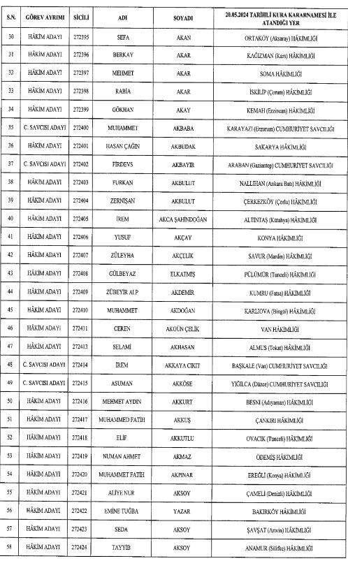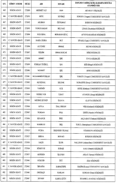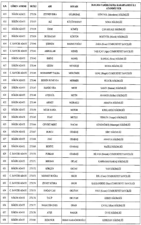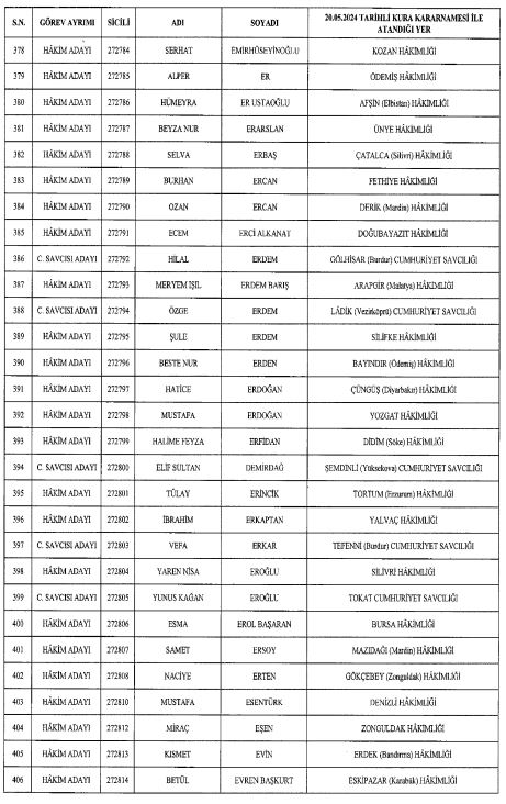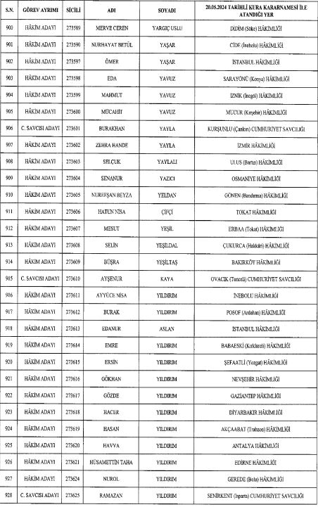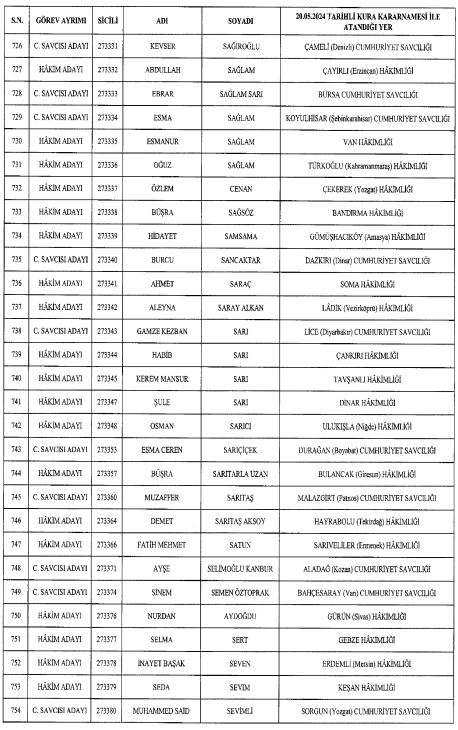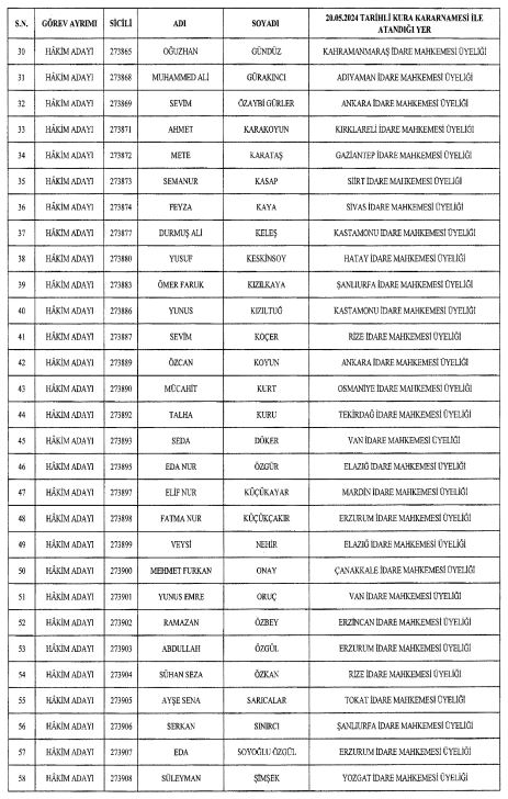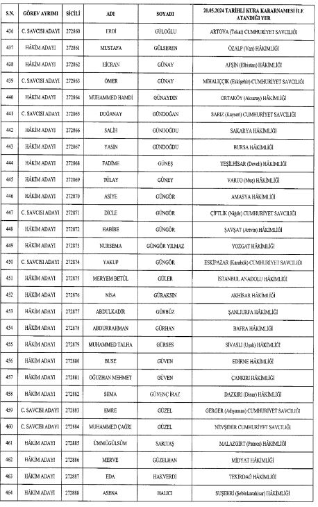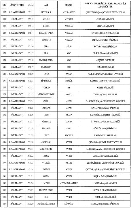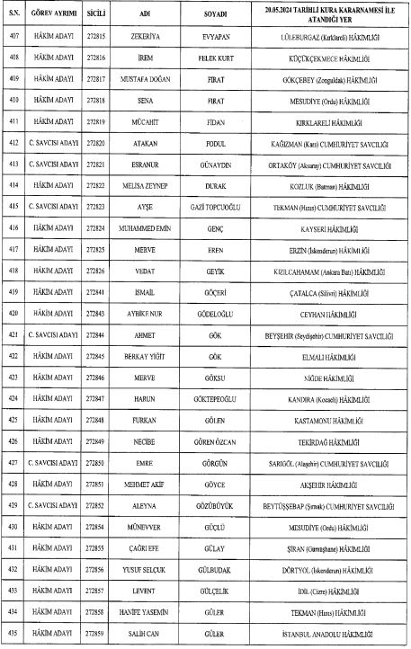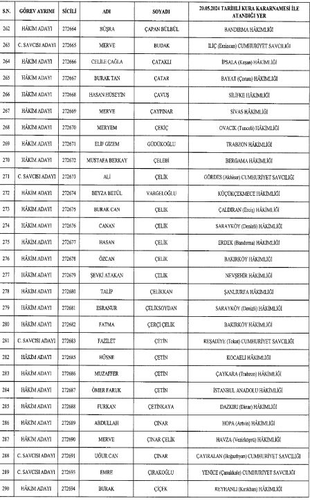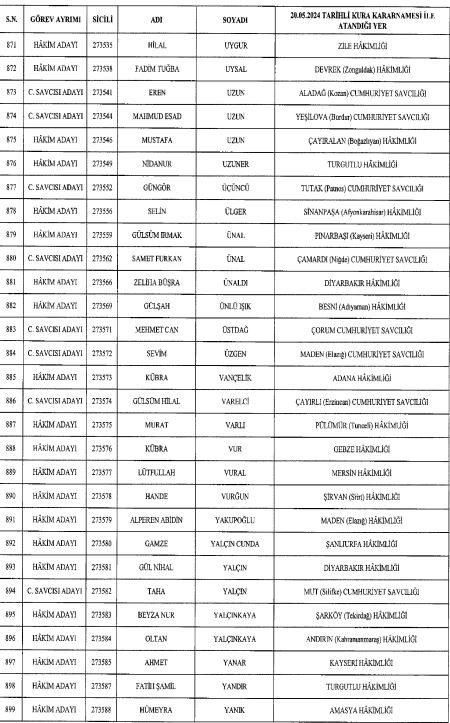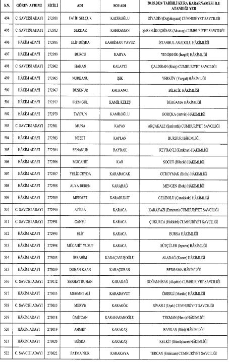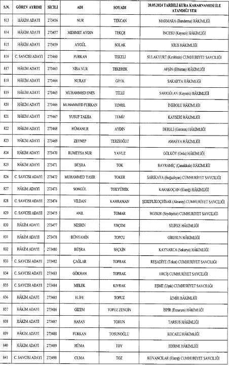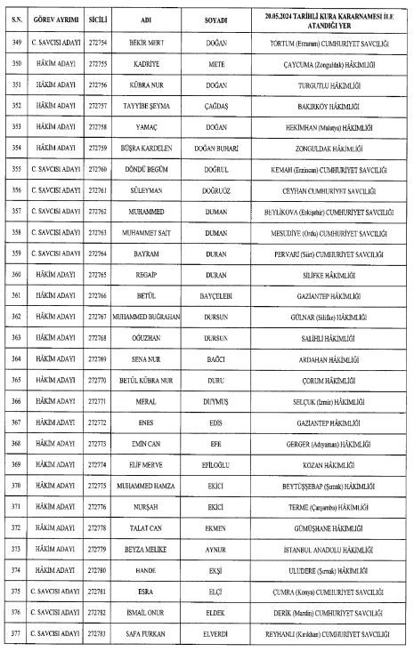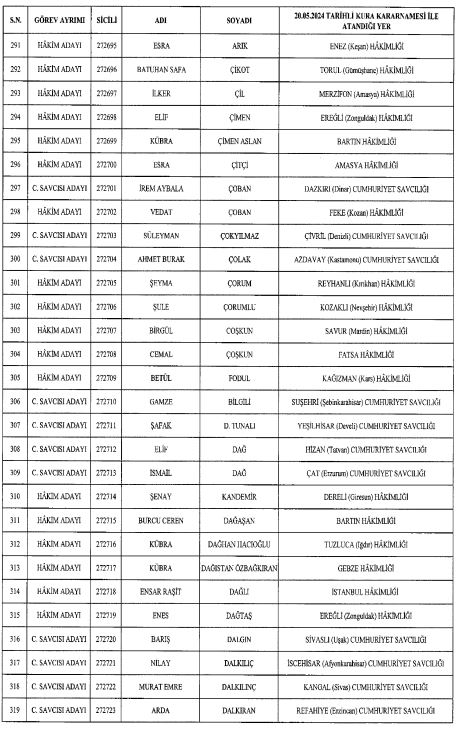 Kararda, “Adli yargı hâkim ve Cumhuriyet savcısı adayları ile idari yargı hâkim adaylarının, Hâkimler ve Savcılar Kurulunca 20.05.2024 tarihinde yapılan ad çekme sonucuna göre, 2802 sayılı Hâkimler ve Savcılar Kanunun 13. maddesi gereğince atanmalarına ilişkin kararname aşağıda gösterilmiştir” ifadelerine yer verildi.