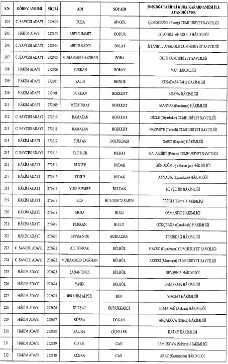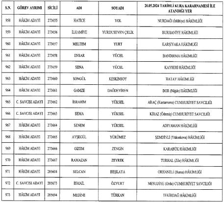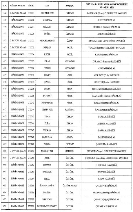Gazete’de yer alan Hakimler ve Savcılar Kurulu Başkanlığı tarafından 20.05.2024 tarihli 691 ve 692 sayılı karara göre adli yargıya 973 hakim ve cumhuriyet savcısı adayı ile 71 idari yargı hakim adayının atanma kararı verildi.