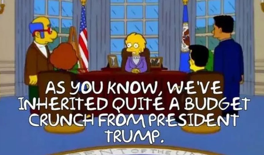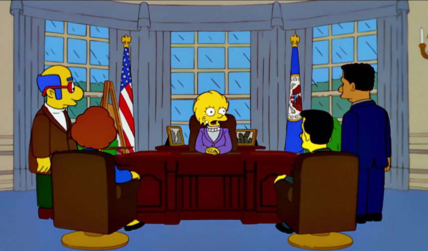 Dizinin belki de en kötü şöhretli vakası olan Donald Trump'ın başkan olduğunu söyleyen 2000 tarihli 'Bart To The Future' bölümü. Lisa'nın başkan olarak yer aldığı bölüm bu. Lisa, Oval Ofis'teyken, "Bildiğiniz gibi, Başkan Trump'tan epey bir bütçe sıkıntısı devraldık." diyor.