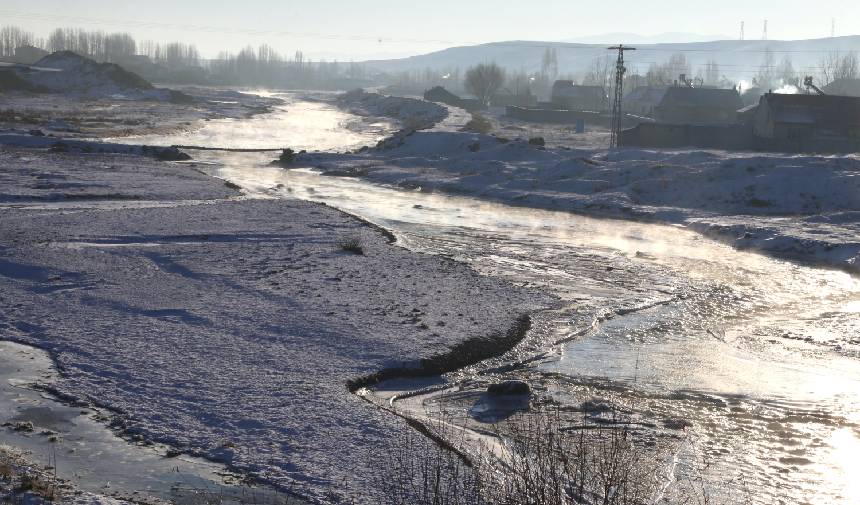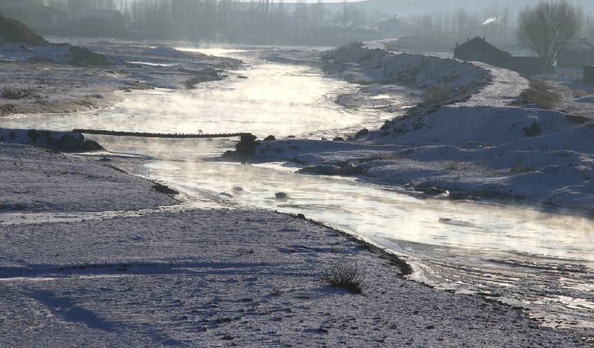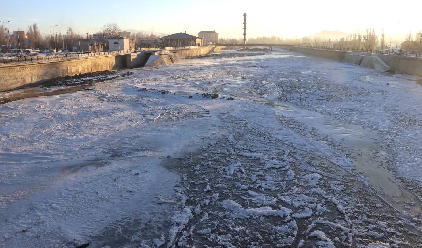 Ağrı'da etkili olan dondurucu soğuk nedeniyle Murat Nehri kısmen buzla kaplandı.