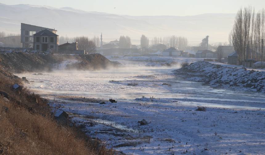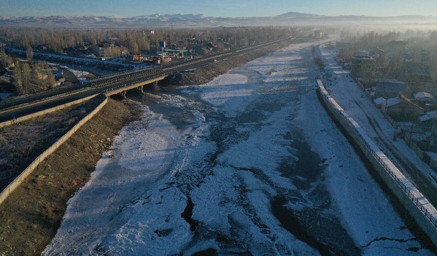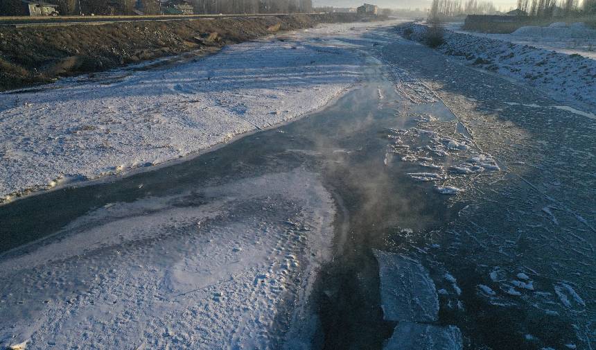 Nehrin yüzeyinden çıkan buhar ve buz kütleleri dronla görüntülendi.