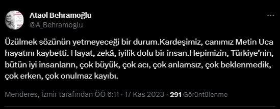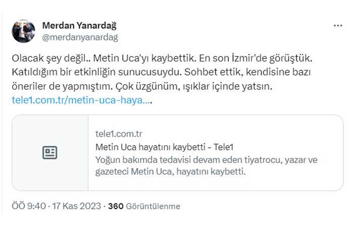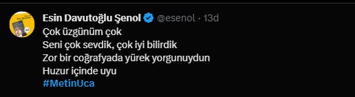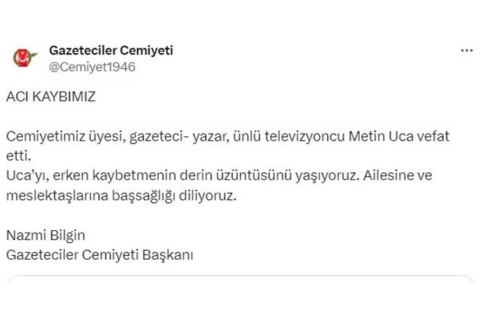 Uca’nın vefatını, menajeri Kübra Kalem Baykara sosyal medya hesabından yaptığı paylaşımla duyurdu. Baykara, paylaşımında “Metin Ucamızı kaybettik. Kalbimiz acıyor” dedi.