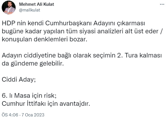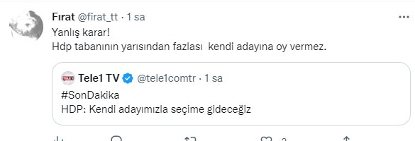 Siyaset bilimciler ve yurttaşlar ise HDP’nin bu kararının seçimleri ikinci tura götüreceği görüşünü paylaştı. Vatandaşlar, aday çıkaracağını açıklayan HDP’ye, kararın AKP’nin işine yarayacağını öne sürerek tepki gösterdi.