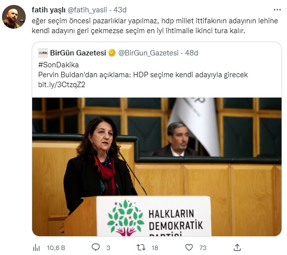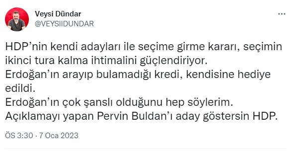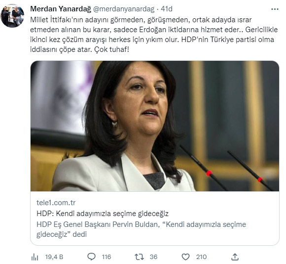Halkların Demokratik Partisi (HDP) Eş Genel Başkanı Pervin Buldan, 2023 genel seçimlerinde partisinin Cumhurbaşkanı adayı çıkaracağını açıkladı. Buldan, “Şimdi herkesin dört gözle beklediği cumhurbaşkanı adayının kim olacağı meselesi. Biz HDP olarak en kısa zamanda kendi cumhurbaşkanı adayımızı Türkiye halklarıyla paylaşacağız. HDP kendi adayını çıkaracak kendi adayını gösterecek ve seçimlere kendi adayıyla gidecek. Bizim Cumhur İttifakı’yla ne Millet İttifakı’yla herhangi bir ortaklığımız yok. Ancak ilkesel yaklaşımlarımız var bunları zamanı geldiğinde oturup konuşabiliriz müzakere edebiliriz, diyalog içinde olabiliriz. Ama HDP’nin şuan ki kararı kendi adayıyla seçimlere girmektir.” ifadelerini kullandı.