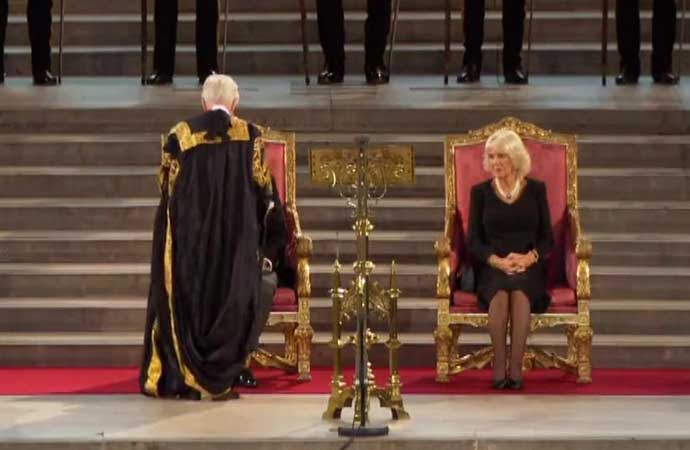 Kral III. Charles ve Konsort Kraliçe Camilla’nın Westminster Hall’a gelmesiyle birlikte Kral Charles’a ilk olarak Lortlar Kamarası Sözcüsü John McFall hitap etti. Lord Mcfall konuşmasında, “Rahmetli Majesteleri'nin yıllar boyunca neşeli, sınırsız ve güven verici varlığı, bu tür uzun ve ilham verici derin ve benzersiz bağlılığın sonsuza dek sona ereceğini düşünmeyi zorlaştırdı. Hepimiz ölçüsüz bir kayıp hissi duyuyor ve onun (Kraliçe’nin) bağlılığını, nezaketini, mizahını, cesaretini ve metanetinin yanı sıra hayatında demirleyen derin inancını hatırlayacağız” ifadelerini kullandı. McFall daha sonra Kral’a sadakat sözü vererek, Kral’ı parlamentoda kabul etmekten ‘gurur ve onur’ duyduğunu söyledi.
