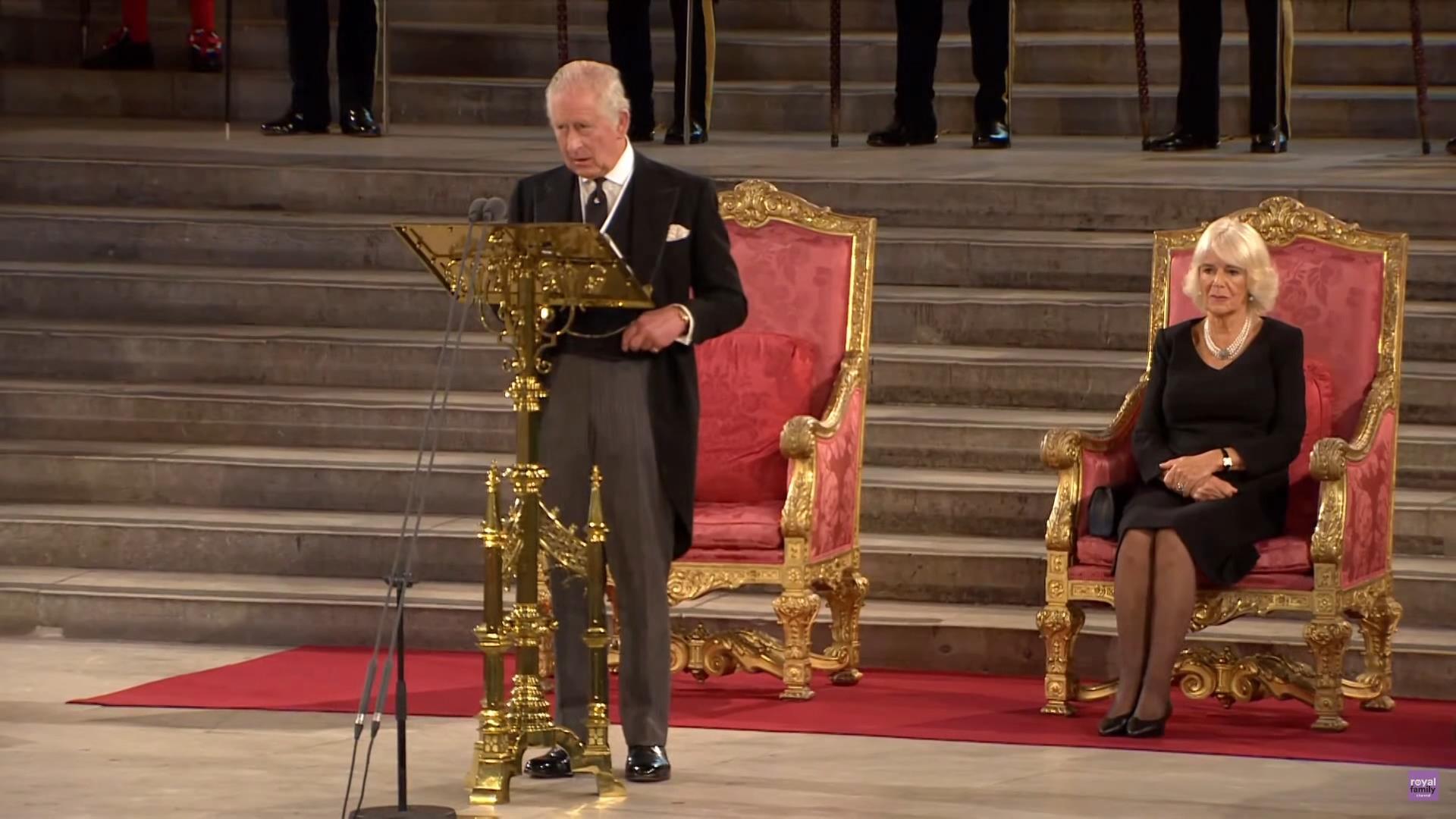 Her iki parlamento meclisinin taziyeleri iletmesinin ardından konuşma yapan Kral III. Charles ise “Bugün önünüzde dururken, etrafımızı saran ve bize her iki meclisin üyelerinin de hepimizin iyiliği için böylesine kişisel bir bağlılıkla kendini adadığı hayati parlamenter gelenekleri hatırlatan tarihin ağırlığını hissetmekten kendimi alamıyorum. Parlamento, demokrasinin yaşayan ve nefes alan aracı ve çağrıldığım makamın ortaçağ öncüllerinin bir hatırlatıcısıdır. Lordlarım ve Avam Kamarası üyeleri, bugün Kraliçe'nin uluslarına ve halklarına adanmış hizmetinin olağanüstü süresini anmak için toplandık. Rahmetli Majesteleri ülkesine ve halkına hizmet etmeye ve ulusumuzun kalbinde yer alan değerli anayasal yönetimin ilkelerini korumaya kendini adadı. Tanrı'nın yardımıyla ve sizin tavsiyenizle, sadakatle takip etmeye karar verdiğim özverili bir görev örneği sunuyor” dedi.