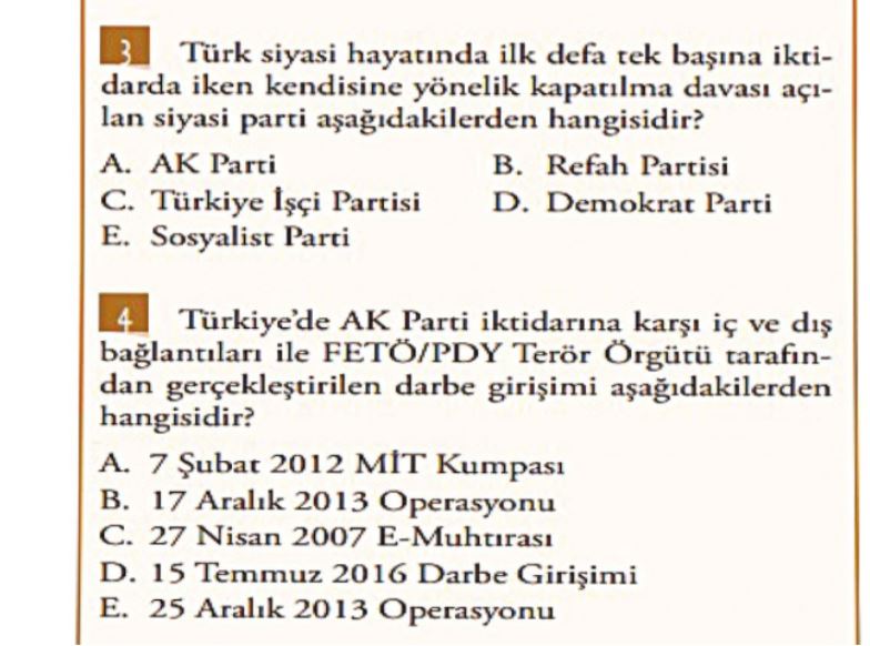 Öğrencilere sorulan MİT TIR'ları davasına ilişkin olan soru ve cevap şıkları şöyle: “FETÖ-PDY Terör Örgütü tarafından 15 Temmuz 2016'da AK Parti Hükümetine karşı yapılan dış destekli darbe girişiminin ilk uluslararası adımı olarak kabul edilen olay aşağıdakilerden hangisidir?”