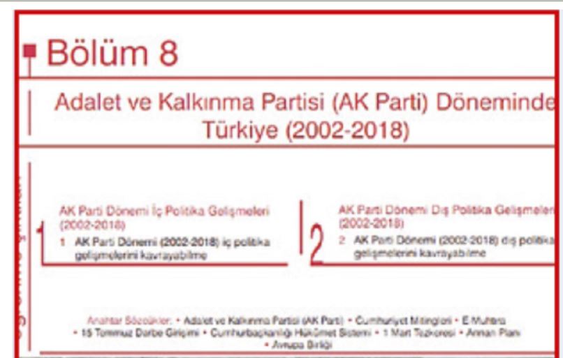 AKP'nin 2002-2018 yılları arasındaki dönemi İnkılap Tarihi ve Atatürkçülük ders kitabına Aralık 2020'de eklenmiş. Kitapta; AKP'nin kuruluşundan, 15 Temmuz'da Cumhurbaşkanı Erdoğan'ın bir televizyon kanalına telefonla bağlanması, Rahip Brunson krizi ve dünya liderleriyle yaptığı görüşmeler gibi çok sayıda olay fotoğraflarla anlatılmış. Afrin operasyonu, FETÖ'nün kumpas davaları Ergenekon ve Balyoz, Cumhurbaşkanlığı seçimleri, siyasi partilerin aldığı oy oranları gibi çok sayıda konu eklenmiş. Cumhurbaşkanı Tayyip Erdoğan'ın şiir nedeniyle cezaevine düştüğüne de vurgu yapılıyor.