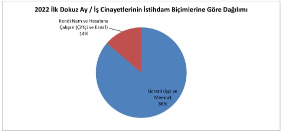 2022 yılının ilk dokuz ayında iş cinayetlerinin istihdam biçimlerine göre dağılımına baktığımızda 1173 ücretli (işçi ve memur) ve 186 kendi nam ve hesabına çalışan (çiftçi ve esnaf) hayatını kaybetti. Yani ölenlerin yüzde 86’sını ücretliler yüzde 14’ünü ise kendi nam ve hesabına çalışanlar oluşturuyor.