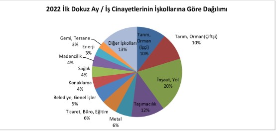 2022 yılının ilk dokuz ayında iş cinayetlerinin işkollarına göre dağılımı şöyle: Tarım, Orman işkolunda 275 emekçi (141 işçi ve 134 çiftçi); İnşaat, Yol işkolunda 269 işçi; Taşımacılık işkolunda 163 işçi; Metal işkolunda 79 işçi; Ticaret, Büro, Eğitim, Sinema işkolunda 76 emekçi; Belediye, Genel İşler işkolunda 74 işçi; Konaklama, Eğlence işkolunda 57 işçi; Sağlık, Sosyal Hizmetler işkolunda 55 işçi; Madencilik işkolunda 53 işçi; Enerji işkolunda 41 işçi; Gemi, Tersane, Deniz, Liman işkolunda 35 işçi; Savunma, Güvenlik işkolunda 27 işçi; Petro-Kimya, Lastik işkolunda 27 işçi; Tekstil, Deri işkolunda 25 işçi; Ağaç, Kâğıt işkolunda 18 işçi; Gıda, Şeker işkolunda 14 işçi; Çimento, Toprak, Cam işkolunda 14 işçi; Basın, Gazetecilik işkolunda 7 işçi; Banka, Finans, Sigorta işkolunda 3 işçi; İletişim işkolunda 2 işçi; Elimizdeki veriler ışığında çalıştığı işkolunu belirleyemediğimiz 45 işçi hayatını kaybetti.