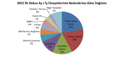 2022 yılının ilk dokuz ayında iş cinayetlerinin nedenlerine göre dağılımı şöyle: Trafik, Servis Kazası nedeniyle 306 işçi; Ezilme, Göçük nedeniyle 266 işçi; Yüksekten Düşme nedeniyle 205 işçi; Kalp Krizi, Beyin Kanaması nedeniyle 148 işçi; Elektrik Çarpması nedeniyle 72 işçi; Zehirlenme, Boğulma nedeniyle 63 işçi; İntihar nedeniyle 56 işçi; Şiddet nedeniyle 55 işçi; Covid-19 nedeniyle 45 işçi; Patlama, Yanma nedeniyle 38 işçi; Nesne Çarpması, Düşmesi nedeniyle 18 işçi; Kesilme, Kopma nedeniyle 11 işçi; Diğer nedenlerden dolayı 76 işçi hayatını kaybetti.