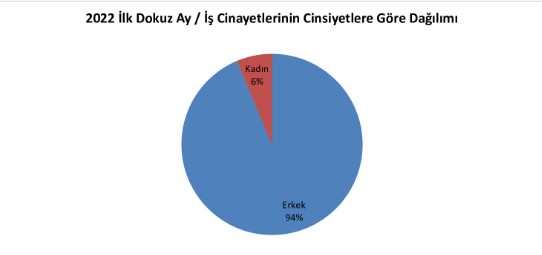 2022 yılının ilk dokuz ayında iş cinayetlerinin cinsiyetlere göre dağılımı şöyle: 86 kadın işçi ve 1273 erkek işçi hayatını kaybetti.