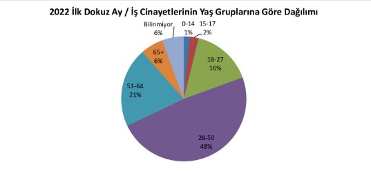 2022 yılının ilk dokuz ayında iş cinayetlerinin yaş gruplarına göre dağılımı şöyle: 14 yaş ve altı 21 çocuk işçi, 15-17 yaş arası 31 çocuk/genç işçi, 18-27 yaş arası 212 işçi, 28-50 yaş arası 659 işçi, 51-64 yaş arası 280 işçi, 65 yaş ve üstü 80 işçi, yaşını bilmediğimiz 76 işçi hayatını kaybetti.