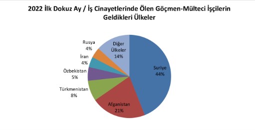 2022 yılının ilk dokuz ayında 75 mülteci/göçmen işçi hayatını kaybetti. Bu işçilerin geldikleri ülkelere bakarsak: 33 işçi Suriyeli; 16 işçi Afganistanlı; 6 işçi Türkmenistanlı, 4 işçi Özbekistanlı; 3’er işçi İranlı ve Rusyalı; 1’er işçi Azerbaycan, Belaruslu, Endonezyalı, Iraklı, Kuveytli, Nijeryalı, Pakistanlı, Sırbistanlı, Ukraynalı ve Yunanistanlı.